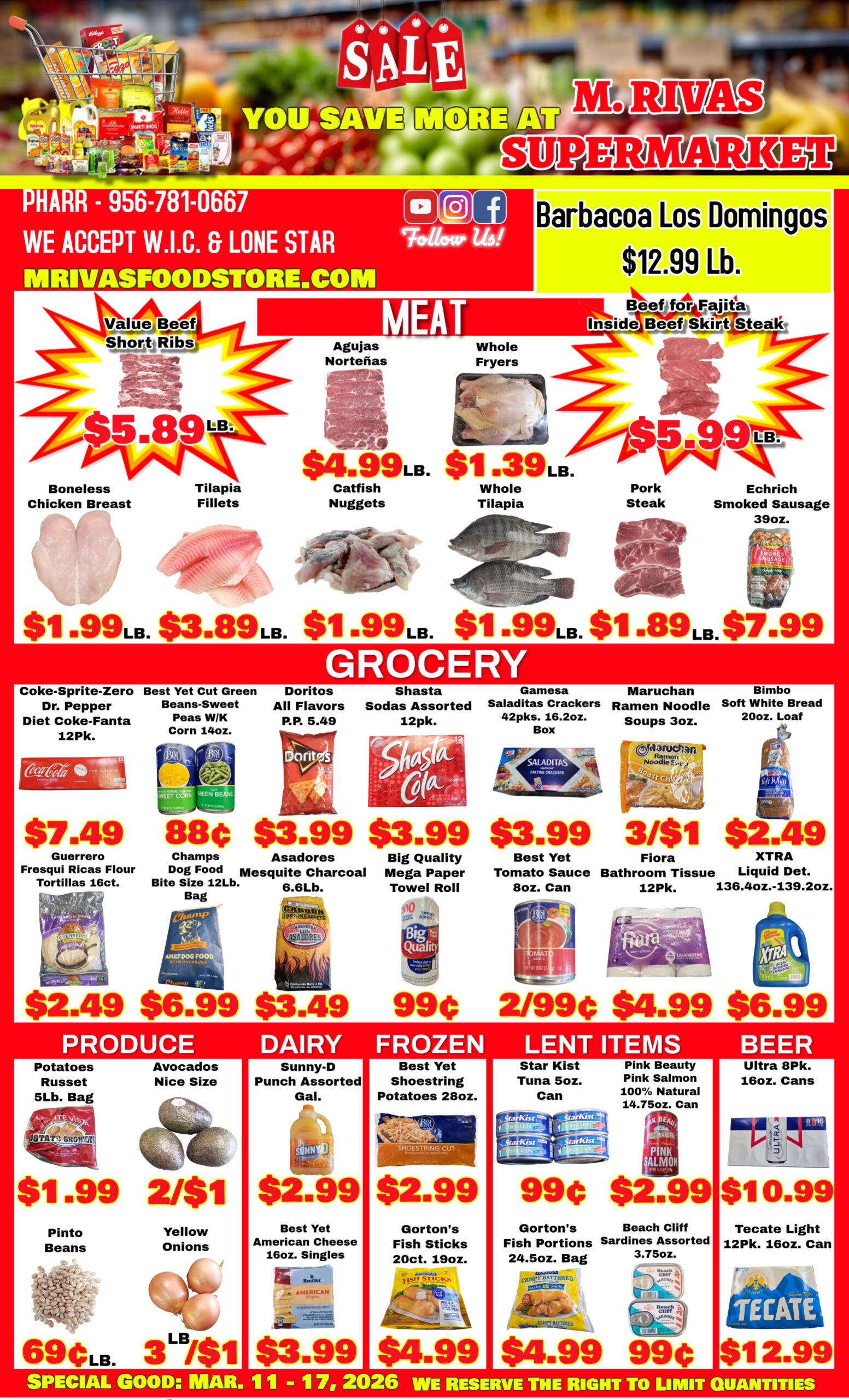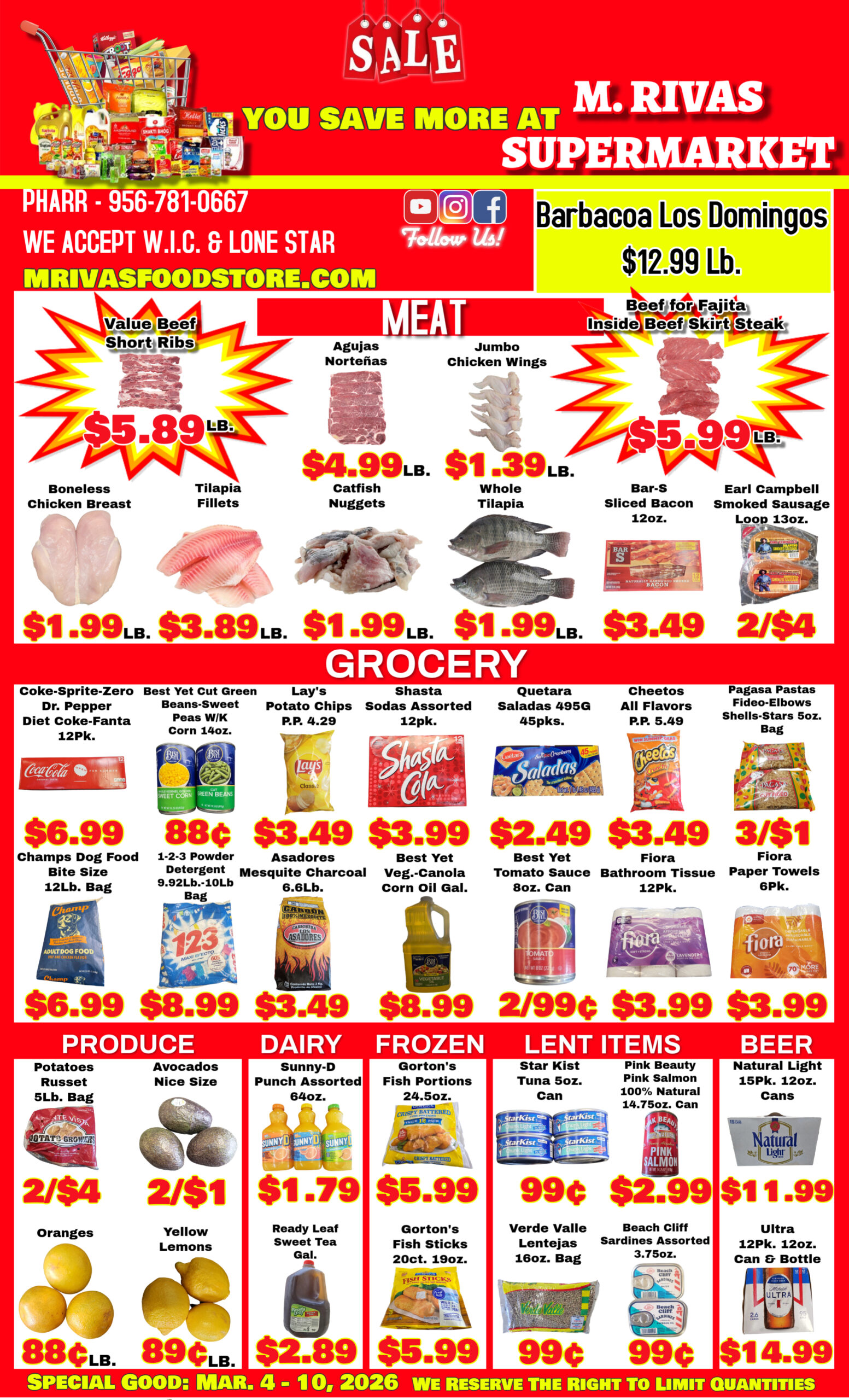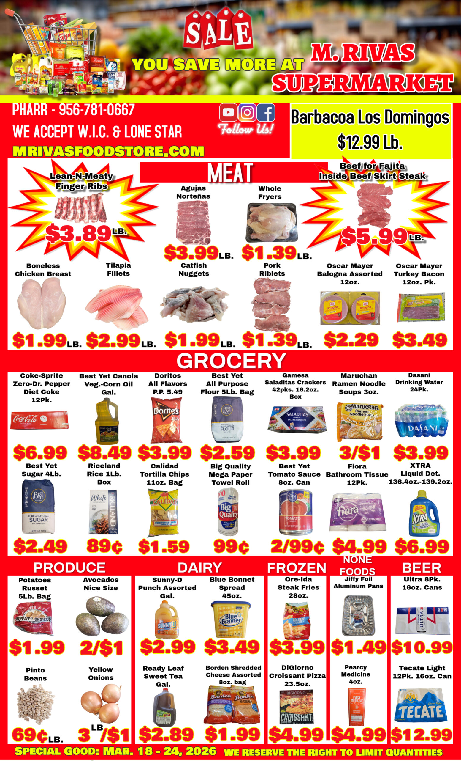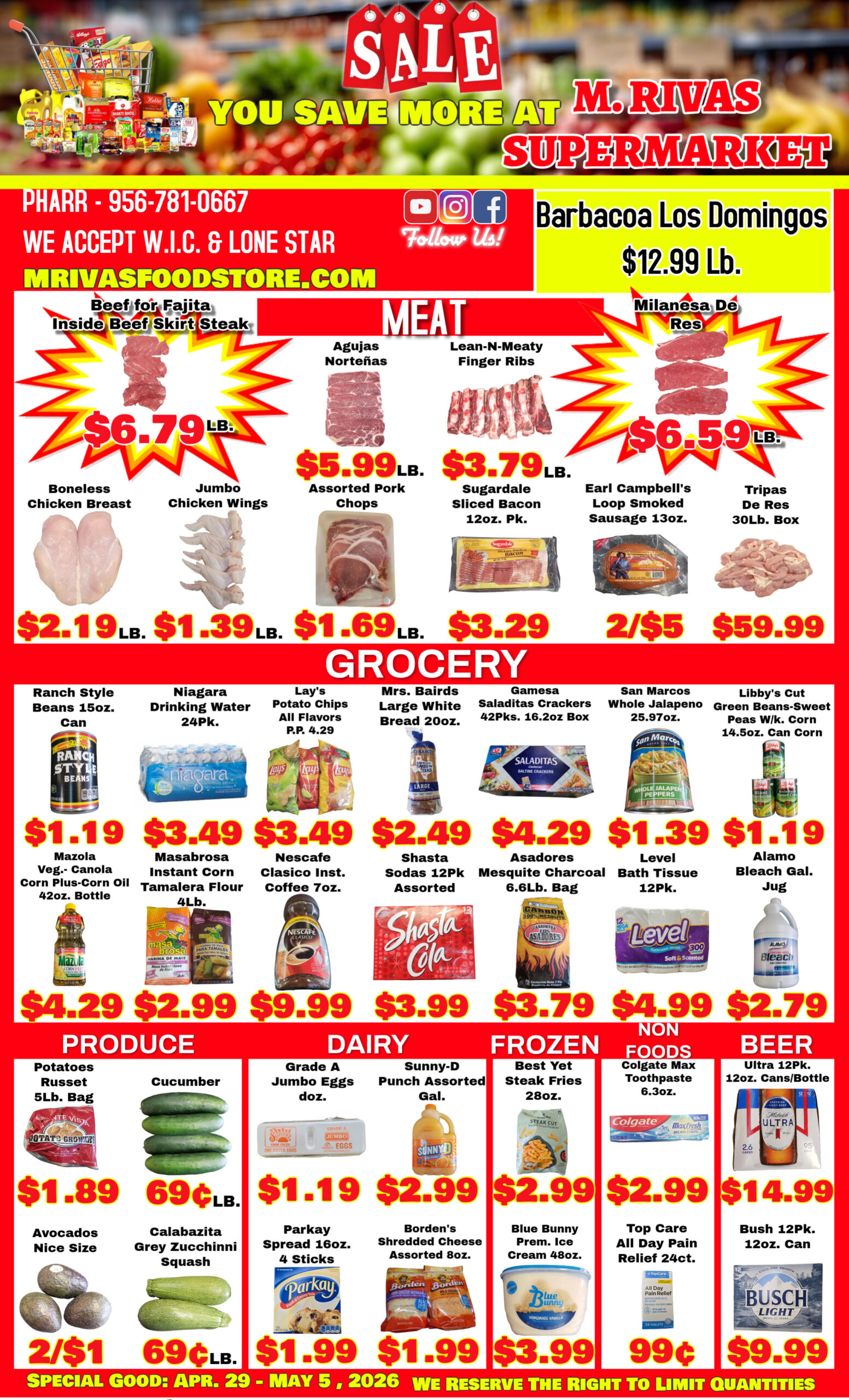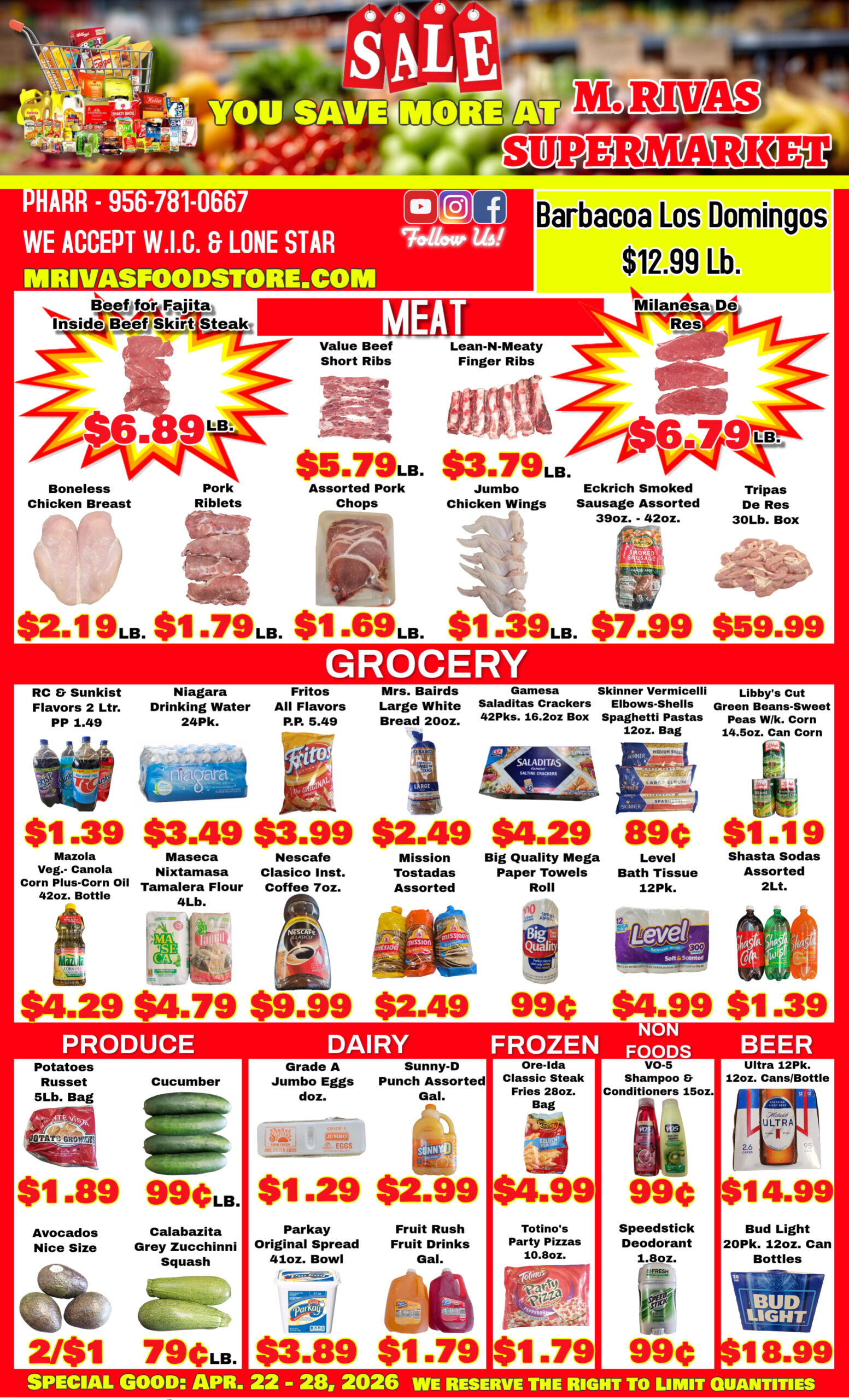 Grocery specials is what we’re known for, our service is what we are remembered for. M Rivas Supermarket , locally owned and operated, has your grocery specials and an assortment of grocery items, from fresh meats to fresh produce to a variety of Mexican spices. Stay refreshed no matter where you are! Water, soft drinks, and other beverages are available at M Rivas Supermarket. The drinks available here are a great way to restore your body’s natural balance, so start sipping. Here you can find a large number of high-quality staples, such as tasty and healthy oil and vinegar options. Add a little more flavor to your meals with our quality selection of spices and seasonings. At M Rivas Supermarket, you can grab some fresh meats, channel your inner chef and fire up the barbecue pit. For mouthwatering tender meats at an affordable price, head over here and get a bang for your buck. M. Rivas always has your fresh meats specials available for any occassion, from a weekend barbecue to a super bowl party. No matter what the occassion is, we got you covered.